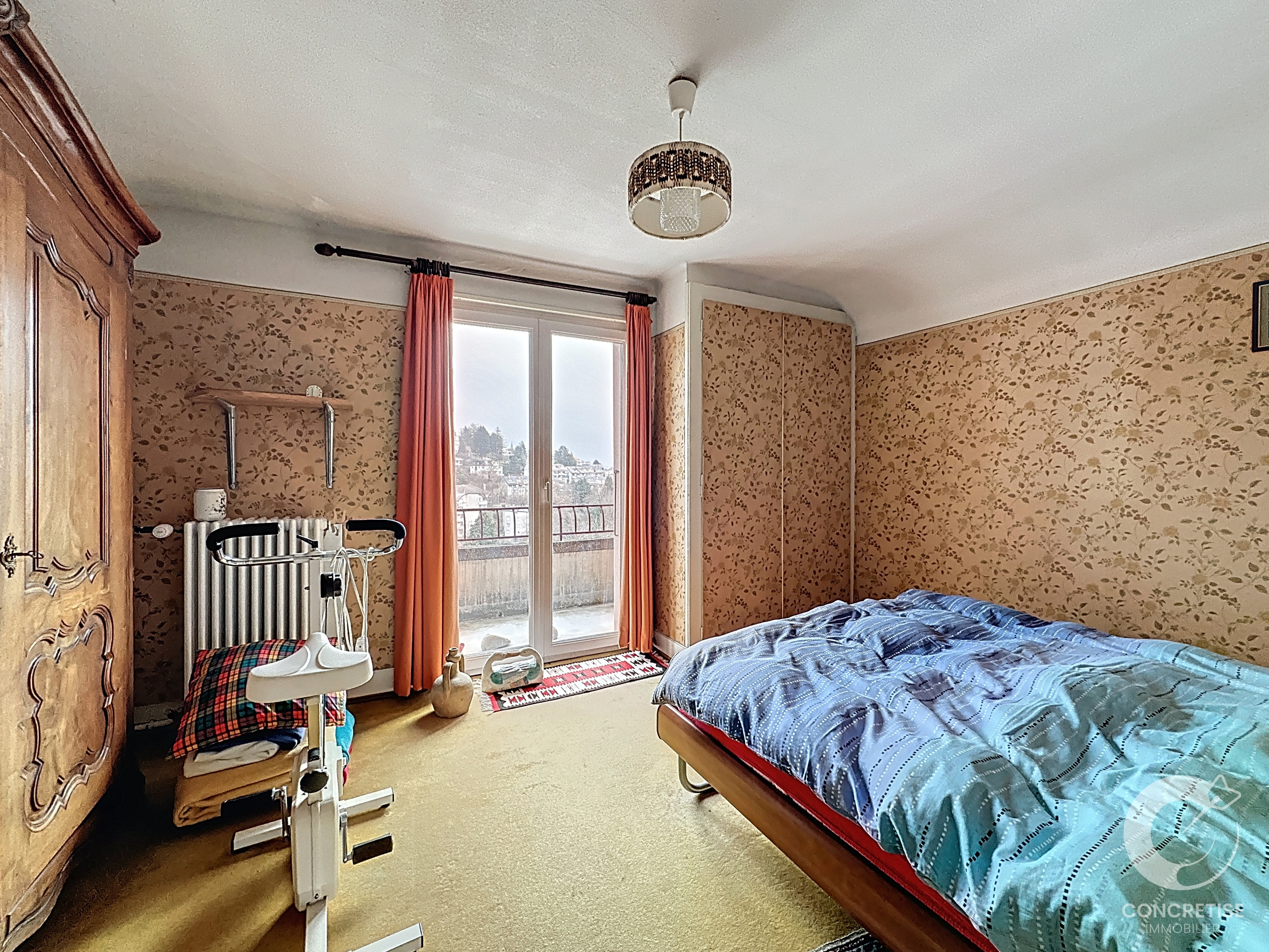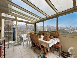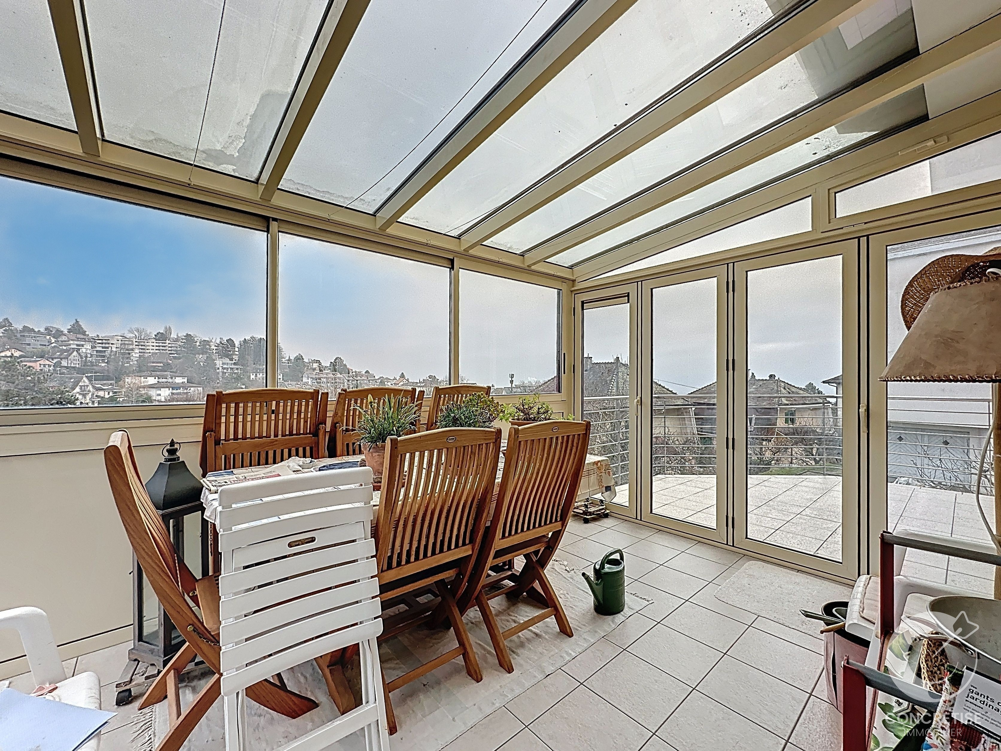 - Grand balcon avec véranda bénéficiant d’une vue dégagée sur le lac et les Alpes.